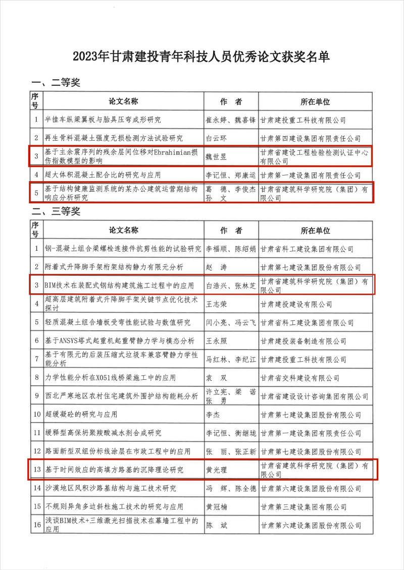 2023年甘肃建投青年科技人员优秀论文评审公示已结束。甘肃建科院共4篇论文获奖,其中二等奖2篇,三等奖2篇。