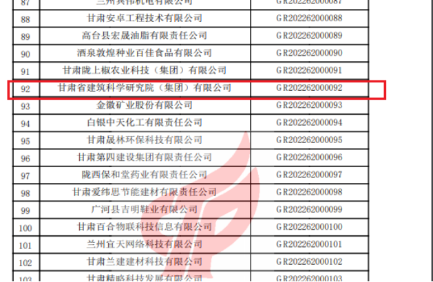近日,高新技术企业认定管理工作网发布公告,公布了甘肃省认定机构2022年认定的第一批高新技术企业进行备案名单。甘肃建科院榜上有名,顺利通过高新技术企业复评。