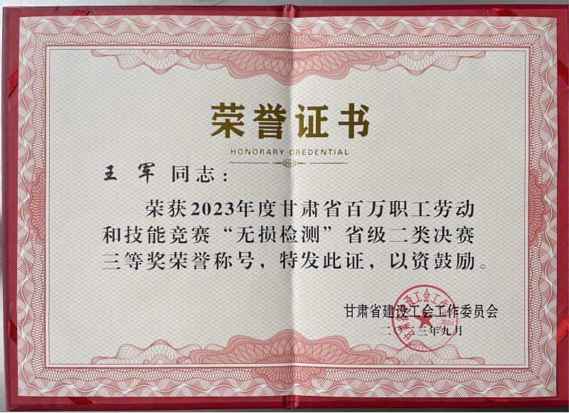 9月7日,由省建设工会、省特种设备研究院、甘肃建投工会主办的甘肃省百万职工劳动和技能竞赛“无损检测”省级二类决赛在甘肃一安建设科技集团有限公司开幕。本次技能竞赛由理论考试和实际操作两部分组成,共有来自全省18家检测单位的51名选手参加。经过两天的角逐,甘肃建科院选手王军荣获三等奖,甘肃建科院荣获优秀组织奖。