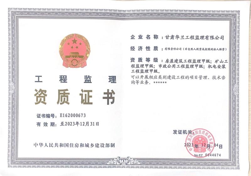 2023年是华兰监理公司成立三十周年,在甘肃建科院的大力支持下,甘肃华兰工程监理有限公司近日成功取得住房和城乡建设部颁发的矿山工程监理甲级资质。